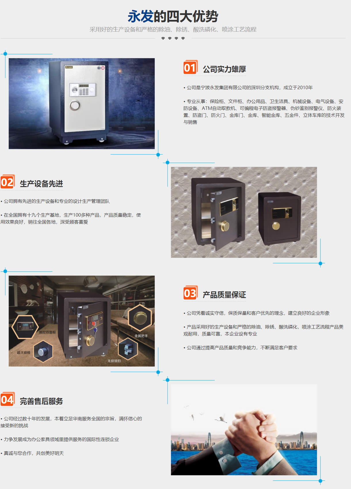 深圳永發(fā)安防產(chǎn)品有限公司 深圳永發(fā)安防產(chǎn)品有限公司,是寧波永發(fā)集團(tuán)有限公司的深圳分支機(jī)構(gòu),成立于2010年,專業(yè)從事:保險(xiǎn)柜、文件柜、辦公用品、衛(wèi)生潔具、機(jī)械設(shè)備、電氣設(shè)備、安防設(shè)備、ATM自動(dòng)取款機(jī)、可編程電子防盜報(bào)警器、偽鈔鑒別報(bào)警儀、防火裝置、防盜門、防火門、金庫(kù)門、金庫(kù)、智能金庫(kù)、五金件、立體車庫(kù)的技術(shù)開發(fā)與銷售。
